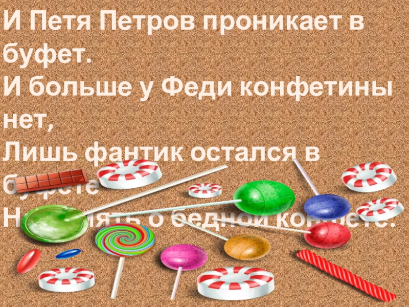 И Петя Петров проникает в буфет.И больше у Феди конфетины нет,Лишь фантик остался в буфетеНа память о