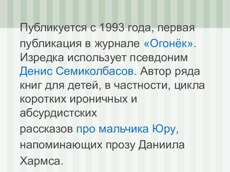 псевдоним Денис Семиколбасов. Автор ряда книг для детей, в частности, цикла коротких ироничных и абсурдистских