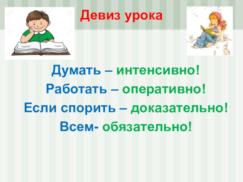 Девиз урокаДумать – интенсивно!Работать – оперативно!Если спорить – доказательно!Всем- обязательно!