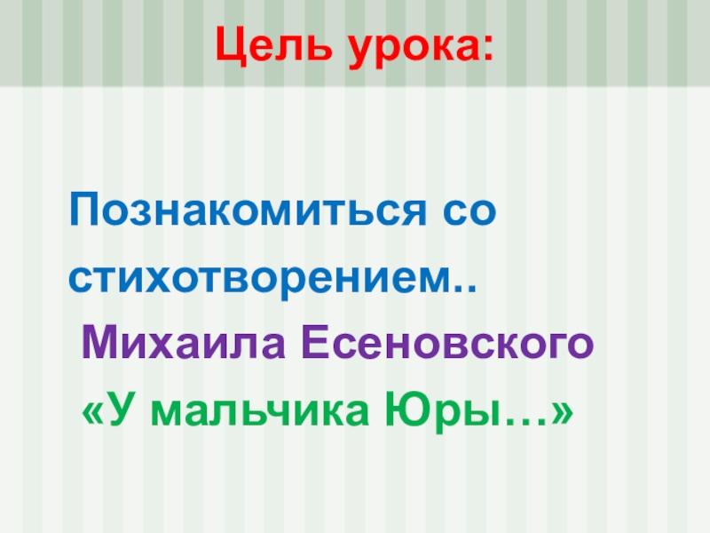 Цель урока:Познакомиться со стихотворением.. Михаила Есеновского «У мальчика Юры…»