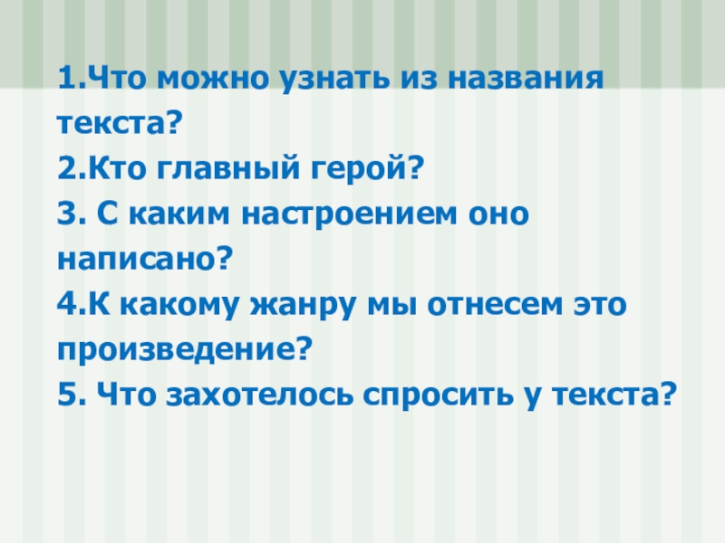 1.Что можно узнать из названия текста?2.Кто главный герой?3. С каким настроением оно написано?4.К какому жанру мы отнесем