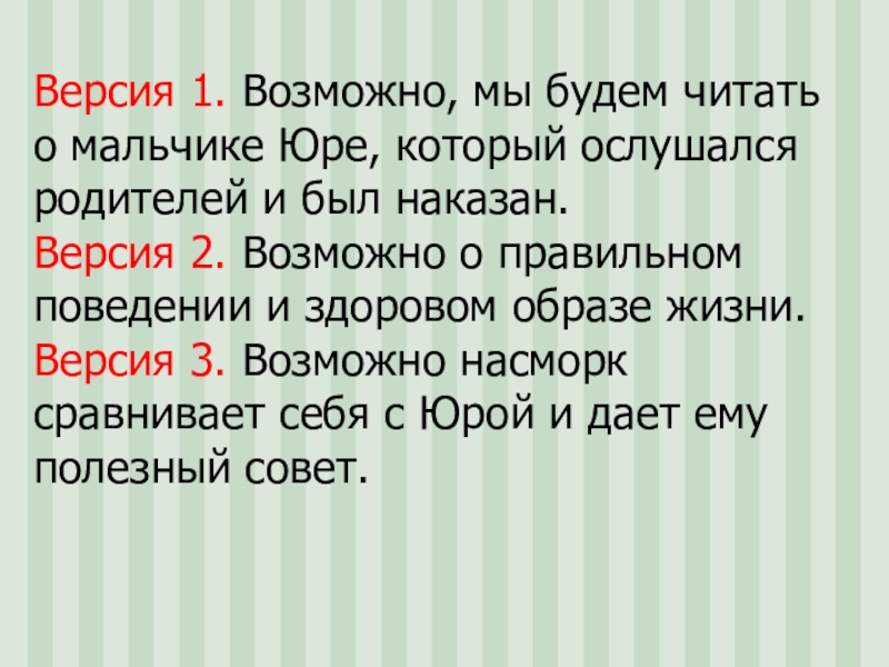 Слайд 17Версия 1. Возможно, мы будем читать о мальчике Юре, который ослушался