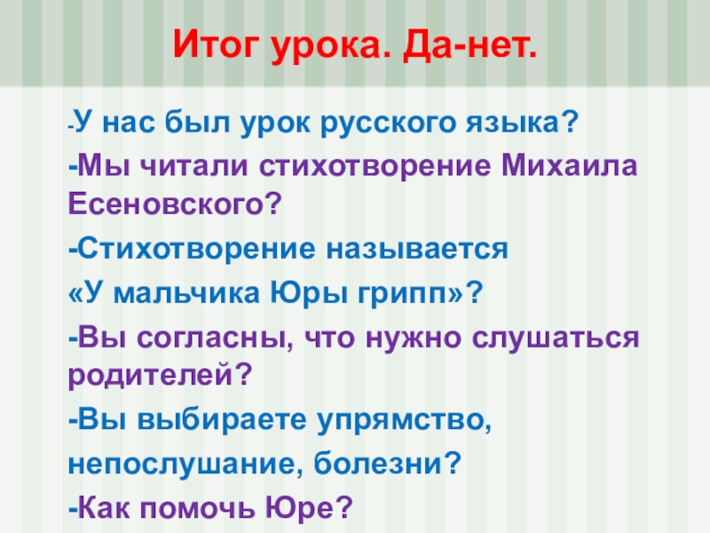 Итог урока. Да-нет.-У нас был урок русского языка?-Мы читали стихотворение Михаила Есеновского?-Стихотворение называется «У мальчика Юры грипп»?-Вы