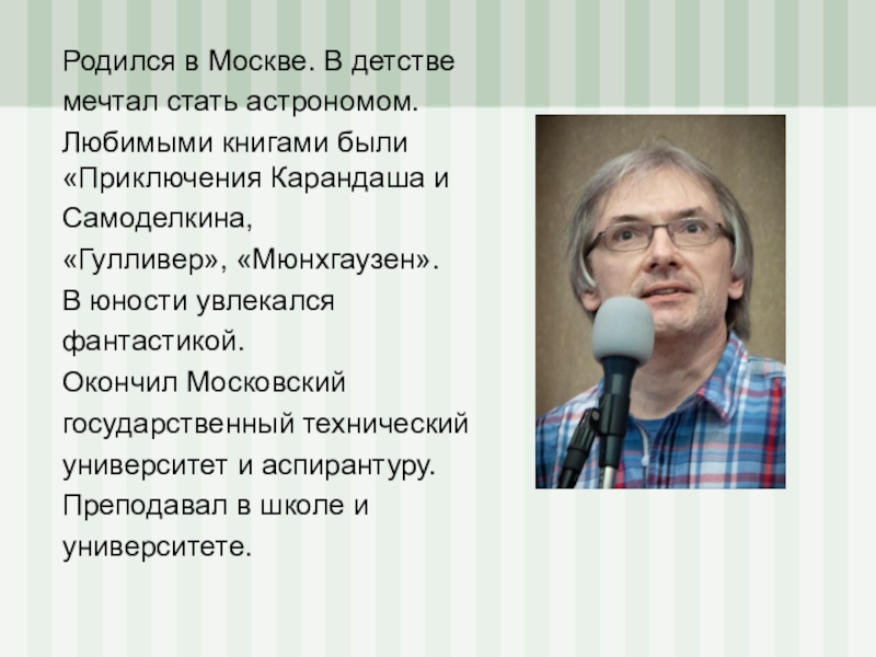 Родился в Москве. В детстве мечтал стать астрономом. Любимыми книгами были «Приключения Карандаша и Самоделкина, «Гулливер», «Мюнхгаузен».