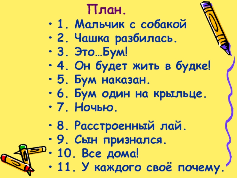 План.1. Мальчик с собакой2. Чашка разбилась.3. Это…Бум! 4. Он будет жить в будке!5. Бум наказан.6. Бум один