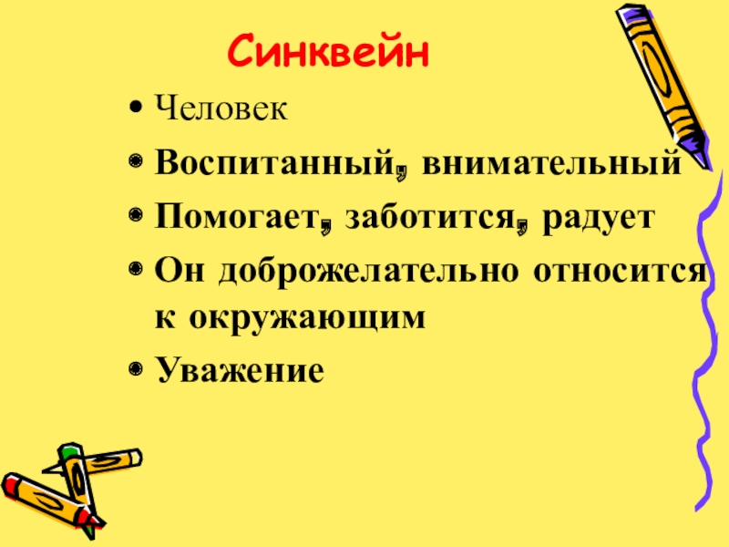 СинквейнЧеловекВоспитанный, внимательныйПомогает, заботится, радуетОн доброжелательно относится к окружающимУважение