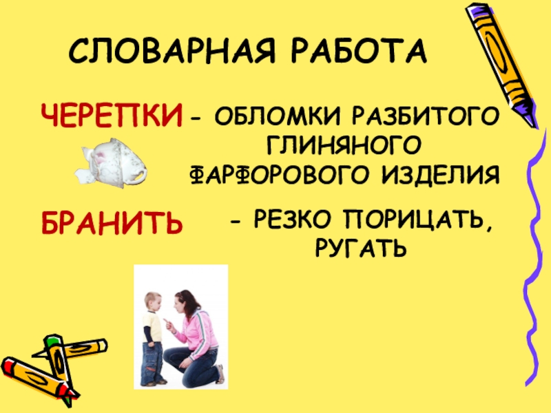 СЛОВАРНАЯ РАБОТАЧЕРЕПКИ- ОБЛОМКИ РАЗБИТОГО ГЛИНЯНОГО ФАРФОРОВОГО ИЗДЕЛИЯБРАНИТЬ- РЕЗКО ПОРИЦАТЬ, РУГАТЬ