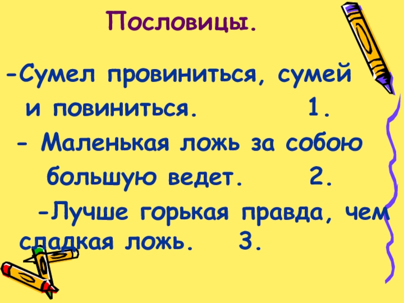 Пословицы.-Сумел провиниться, сумей  и повиниться.     1. - Маленькая ложь за собою