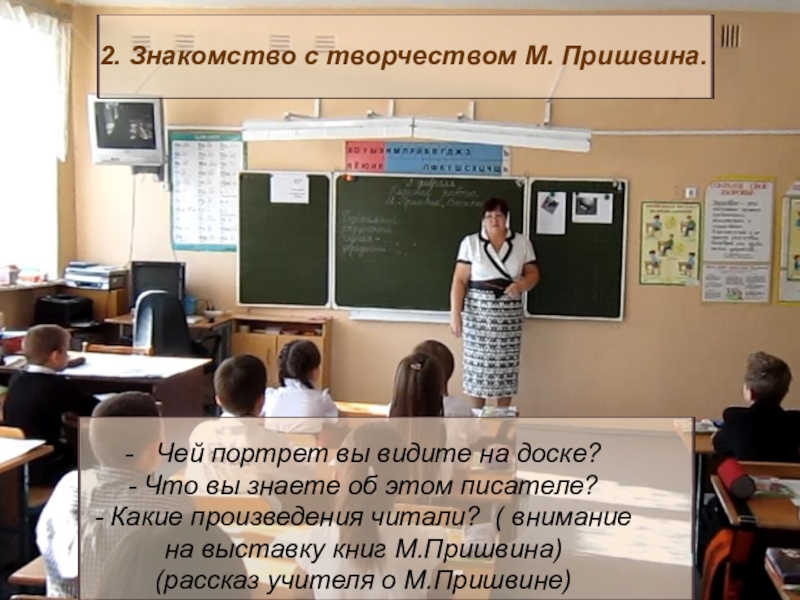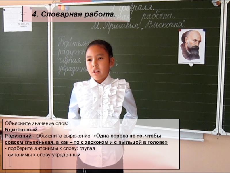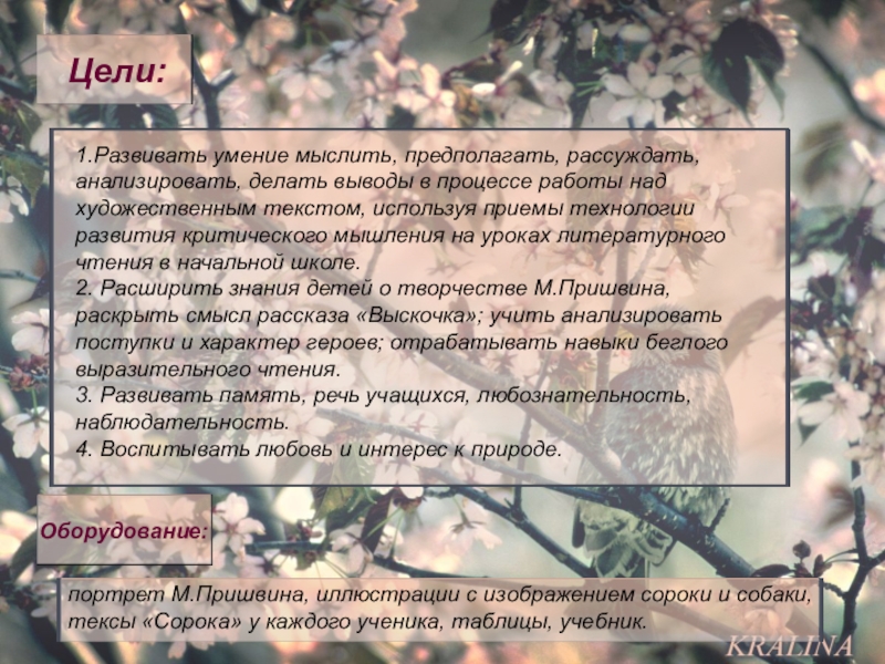 портрет М.Пришвина, иллюстрации с изображением сороки и собаки, тексы «Сорока» у каждого ученика, таблицы, учебник.