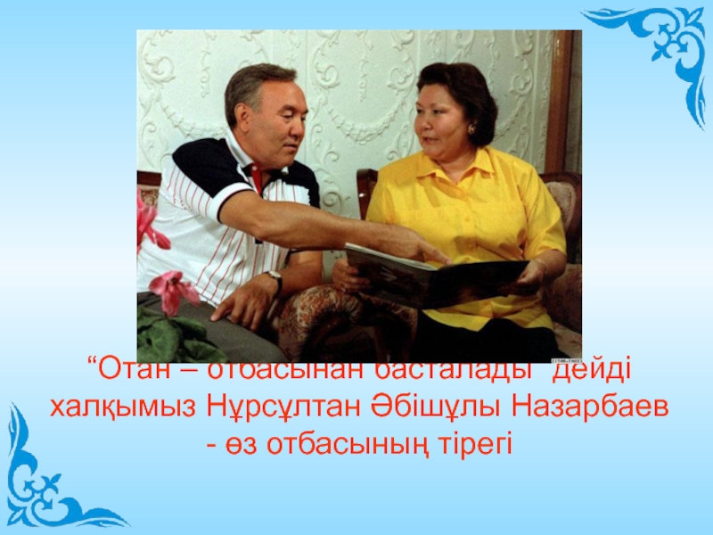 Слайд 8“Отан – отбасынан басталады” дейді халқымыз Нұрсұлтан Әбішұлы Назарбаев - өз