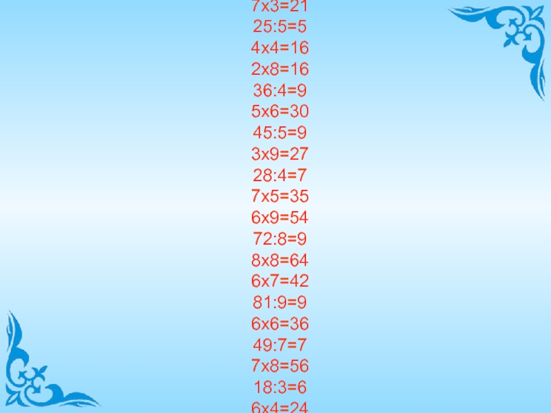 3х9=27 28:4=7 7х5=35 6х9=54 72:8=9 8х8=64 6х7=42 81:9=9 6х6=36 49:7=7 7х8=56 18:3=6 6х4=24