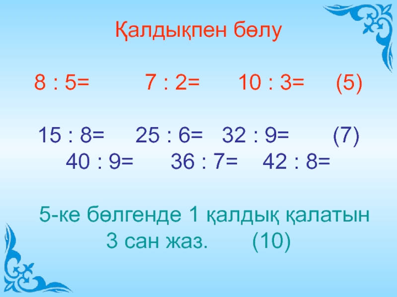 Қалдықпен бөлу  8 : 5=     7 : 2=   10 :