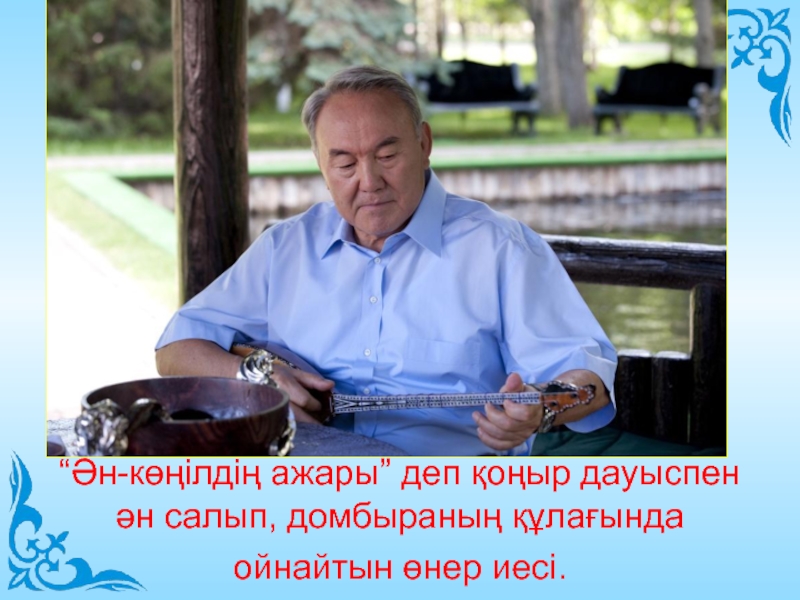Слайд 25“Ән-көңілдің ажары” деп қоңыр дауыспен ән салып, домбыраның құлағында ойнайтын өнер