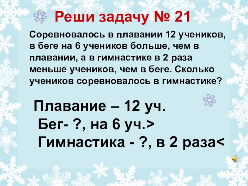 Соревновалось в плавании 12 учеников, в беге на 6 учеников больше, чем в плавании, а в гимнастике в 2 раза меньше учеников, чем в беге. Сколько учеников соревновалось в гимнастике?