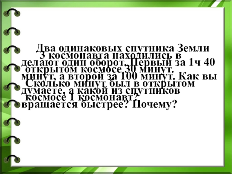 3 космонавта находились в открытом космосе 30 минут. Сколько минут был в открытом космосе 1 космонавт?