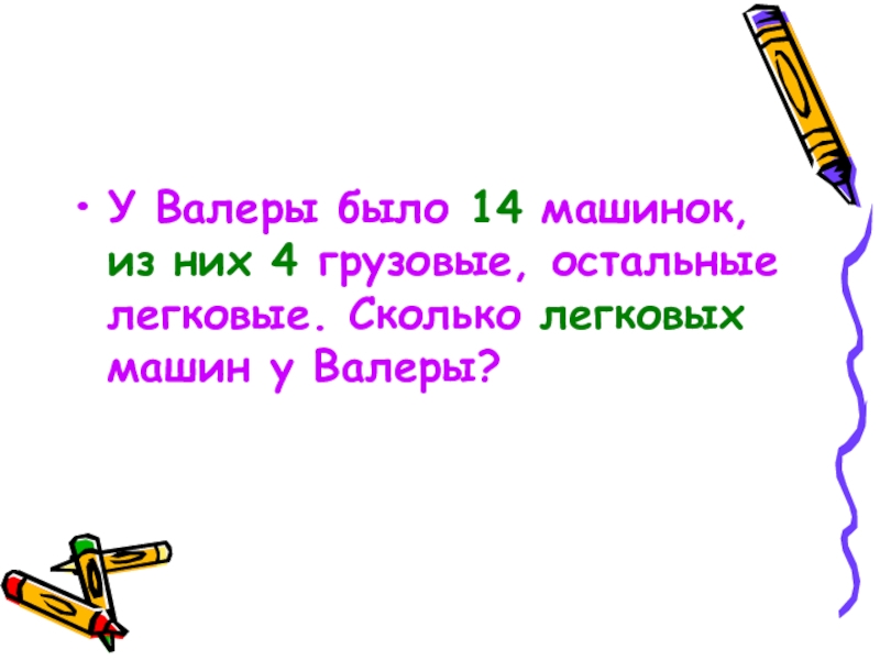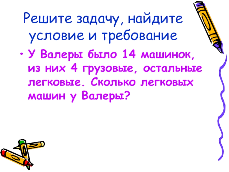 Решите задачу, найдите условие и требованиеУ Валеры было 14 машинок, из них 4 грузовые, остальные легковые. Сколько