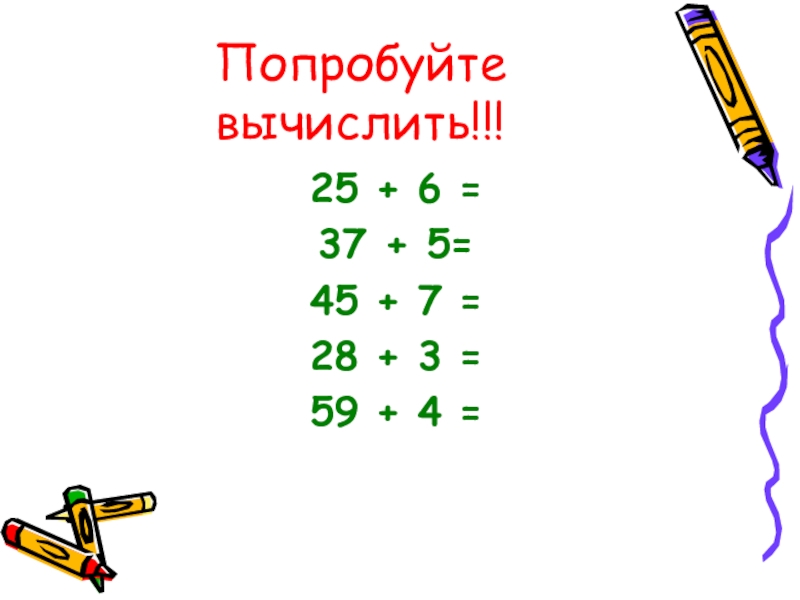 Попробуйте вычислить!!!25 + 6 = 37 + 5= 45 + 7 = 28 + 3 = 59