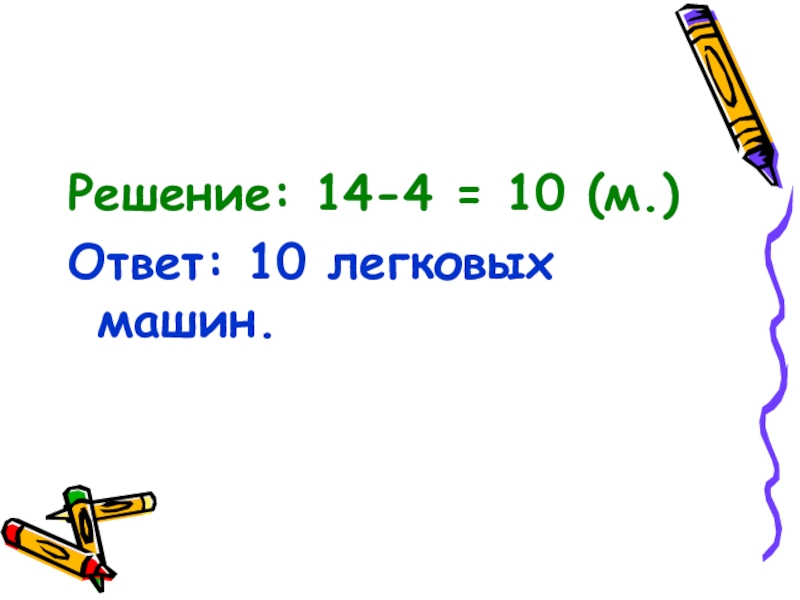 Решение: 14-4 = 10 (м.)Ответ: 10 легковых машин.