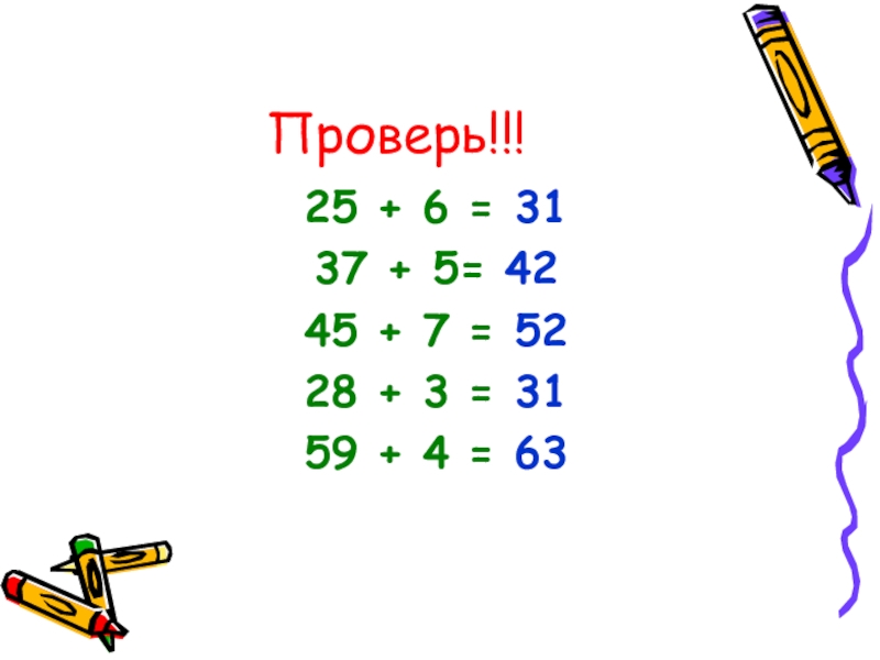 Проверь!!!25 + 6 = 3137 + 5= 4245 + 7 = 5228 + 3 = 3159 +