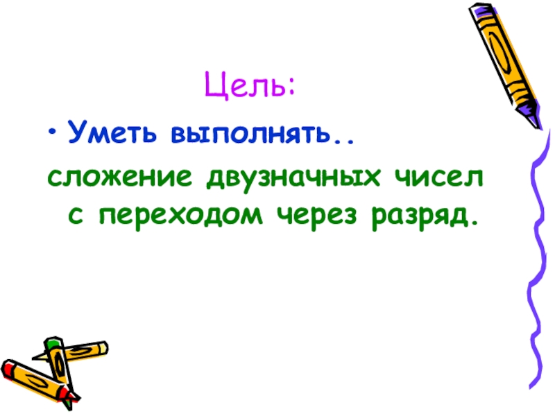 Цель:Уметь выполнять..сложение двузначных чисел с переходом через разряд.