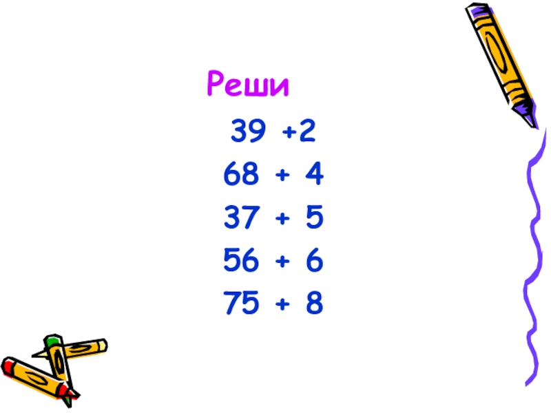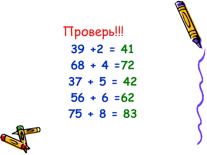 Проверь!!!39 +2 = 4168 + 4 =7237 + 5 = 4256 + 6 =6275 + 8 =
