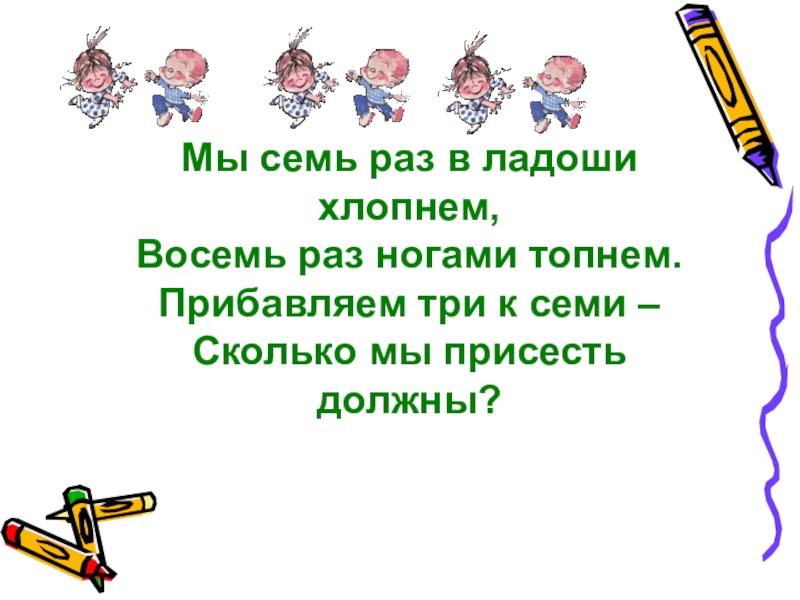 Мы семь раз в ладоши хлопнем,Восемь раз ногами топнем.Прибавляем три к семи – Сколько мы присесть должны?