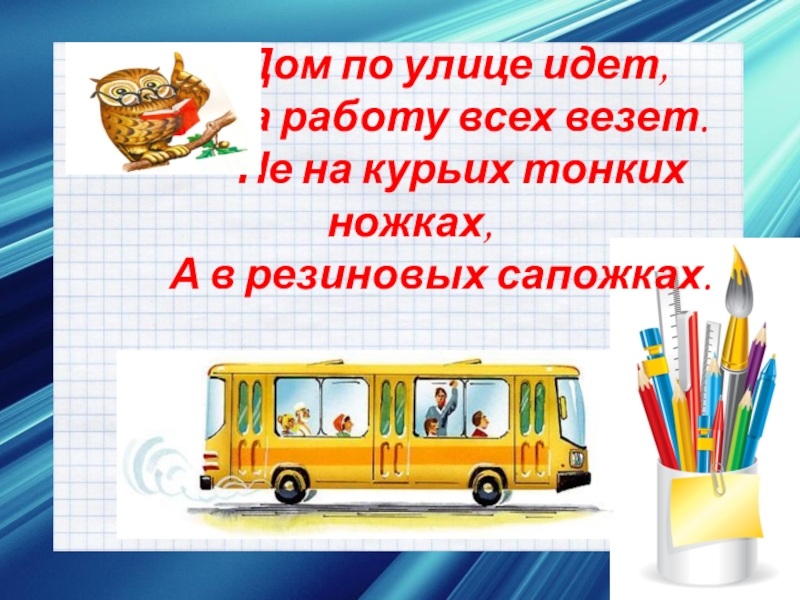 Дом по улице идет, На работу всех везет. Не на курьих тонких ножках,