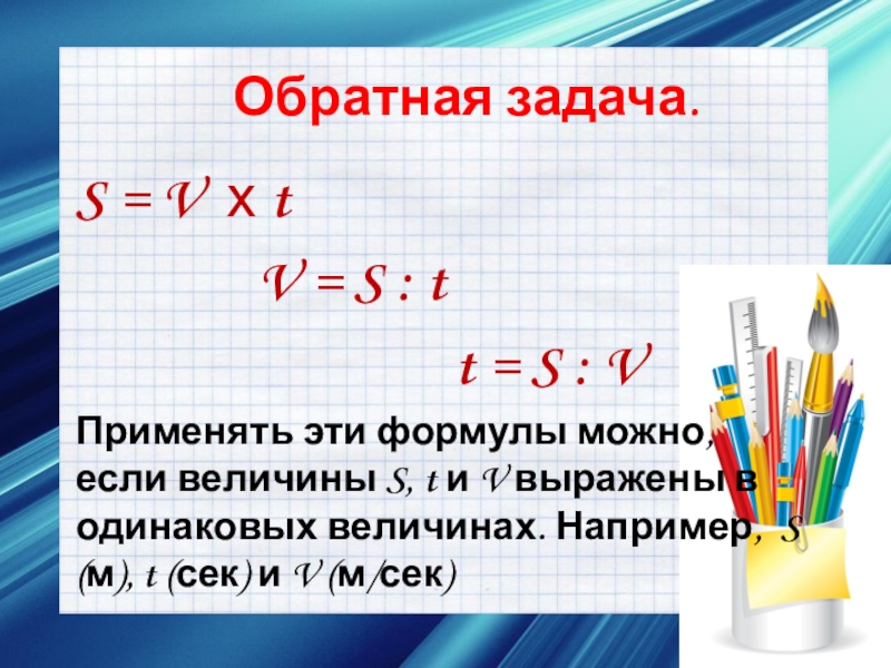 Применять эти формулы можно, если величины S, t и V выражены в одинаковых величинах. Например, S (м), t (сек) и V (м/сек)