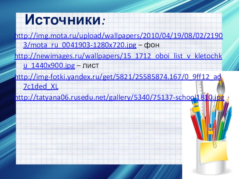 Источники:http://img.mota.ru/upload/wallpapers/2010/04/19/08/02/21903/mota_ru_0041903-1280x720.jpg – фонhttp://newimages.ru/wallpapers/15_1712_oboi_list_v_kletochku_1440x900.jpg – листhttp://img-fotki.yandex.ru/get/5821/25585874.167/0_9ff12_ad7c1ded_XLhttp://tatyana06.rusedu.net/gallery/5340/75137-school1810.jpg