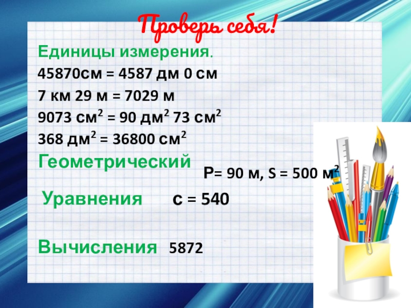 Проверь себя!Единицы измерения.45870см = 4587 дм 0 см7 км 29 м = 7029 м9073 см2 = 90