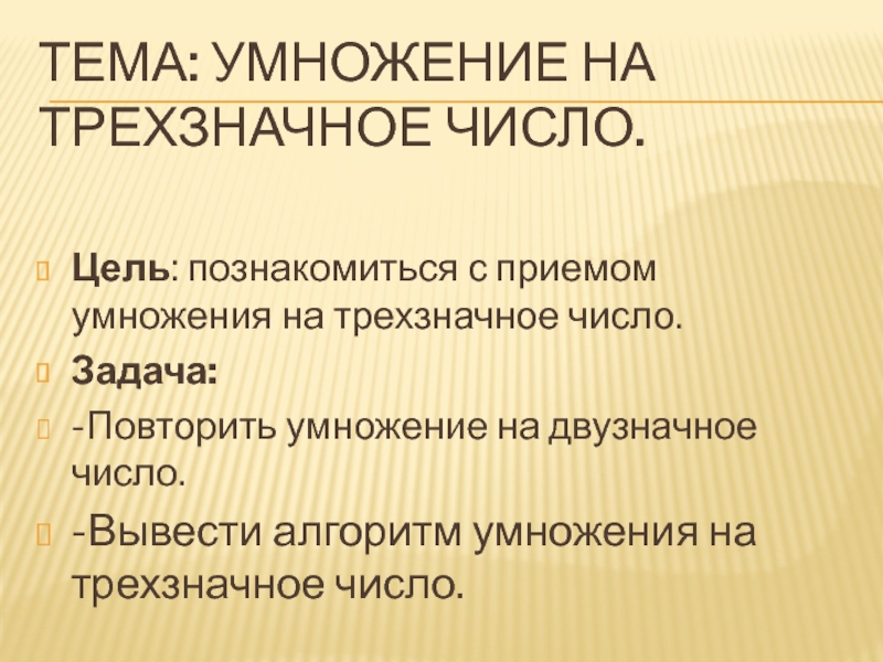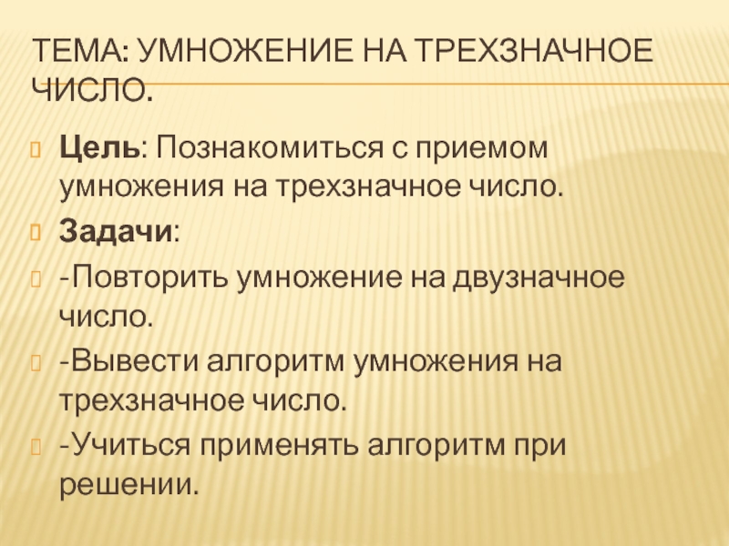 Тема: умножение на трехзначное число. Цель: познакомиться с приемом умножения на трехзначное число. Задача: вывести алгоритм умножения