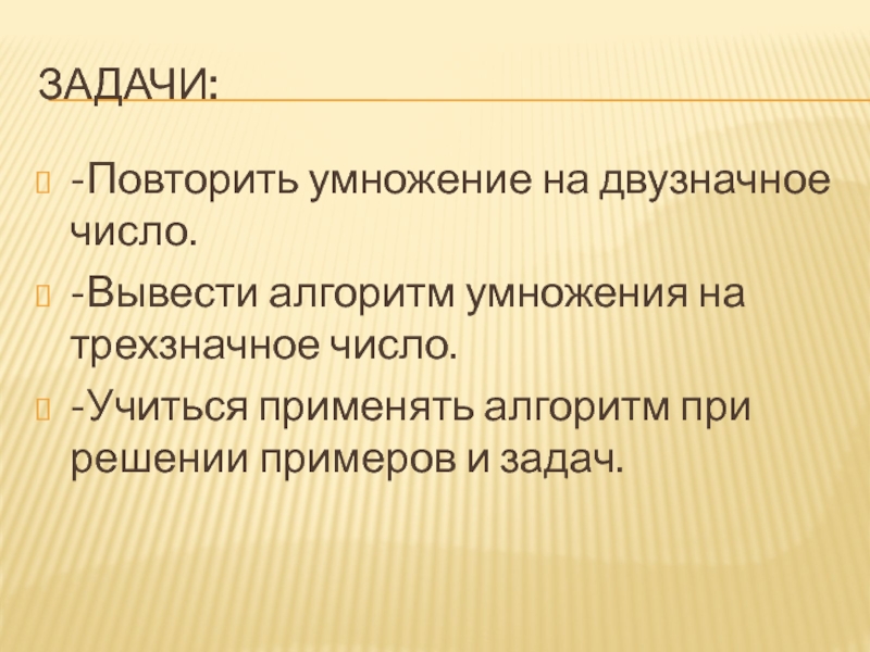 Задачи: -Повторить умножение на двузначное число.-Вывести алгоритм умножения на трехзначное число.-Учиться применять алгоритм при решении примеров и