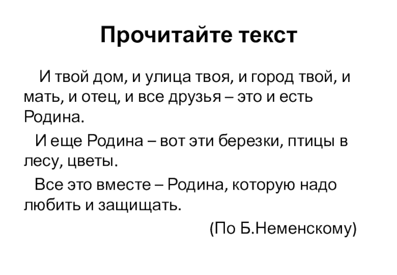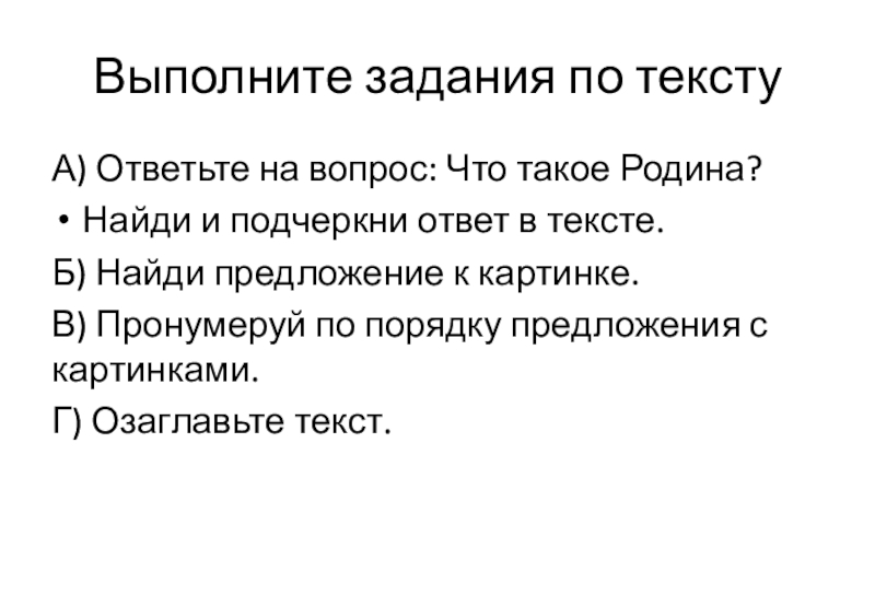Выполните задания по текстуА) Ответьте на вопрос: Что такое Родина? Найди и подчеркни ответ в тексте.Б) Найди