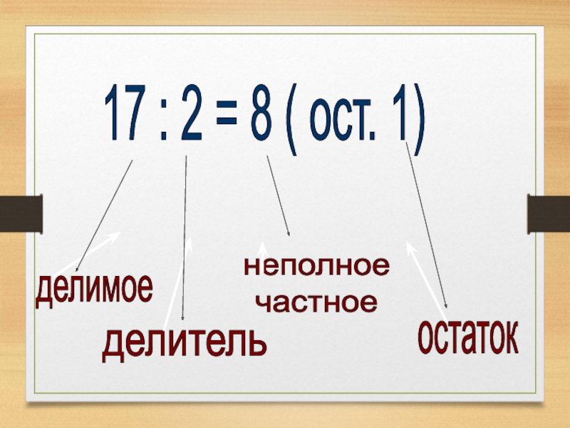 17 : 2 = 8 ( ост. 1)делимоеделительнеполное частноеостаток