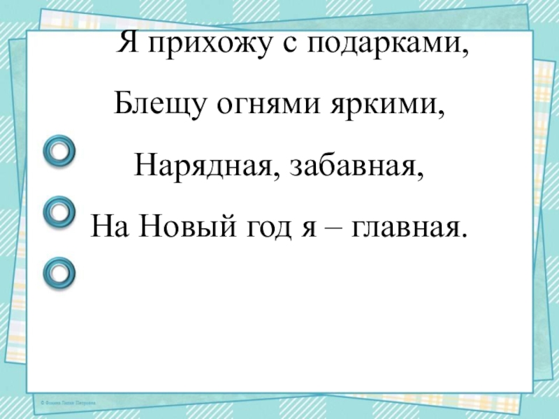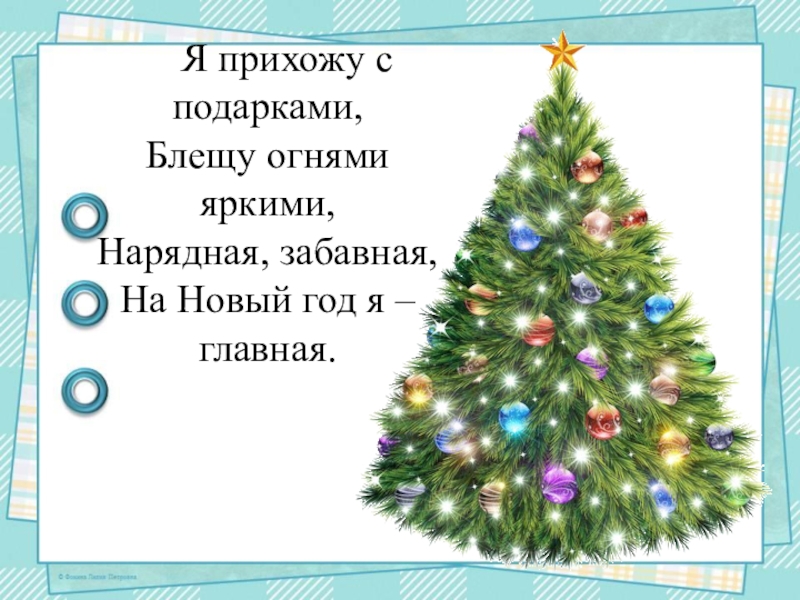 Я прихожу с подарками, Блещу огнями яркими, Нарядная, забавная,  На Новый год я – главная.