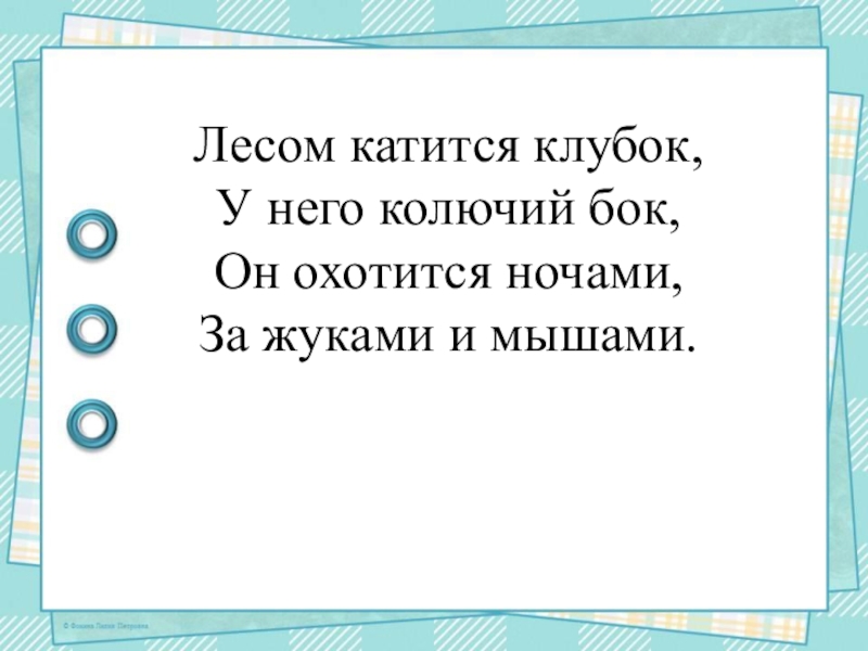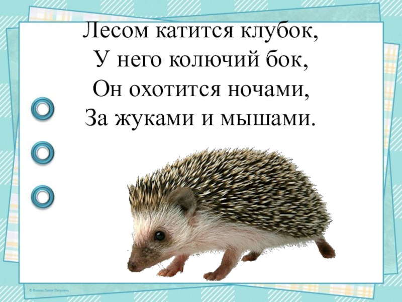 Слайд 12Лесом катится клубок, У него колючий бок, Он охотится ночами, За жуками и мышами.