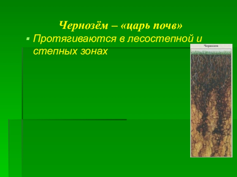 Чернозём – «царь почв»Протягиваются в лесостепной и степных зонах