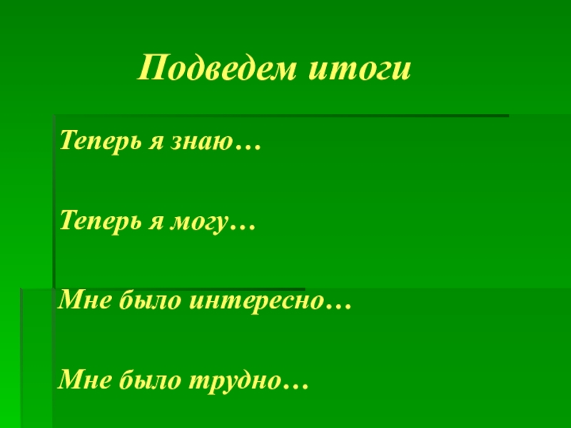 Подведем итогиТеперь я знаю…Теперь я могу…Мне было интересно…Мне было трудно…