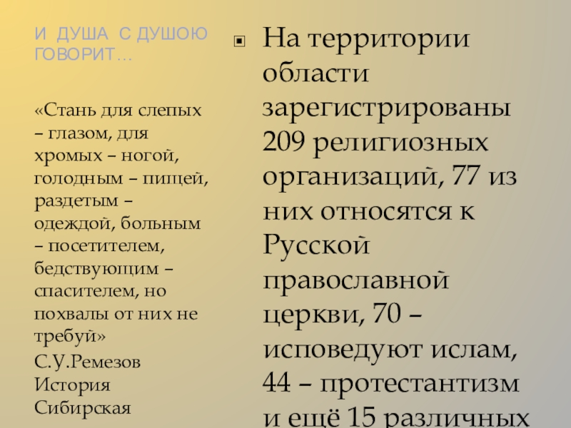 На территории области зарегистрированы 209 религиозных организаций, 77 из них относятся к Русской православной церкви, 70 – исповедуют ислам, 44 – протестантизм и ещё 15 различных ветвлений.