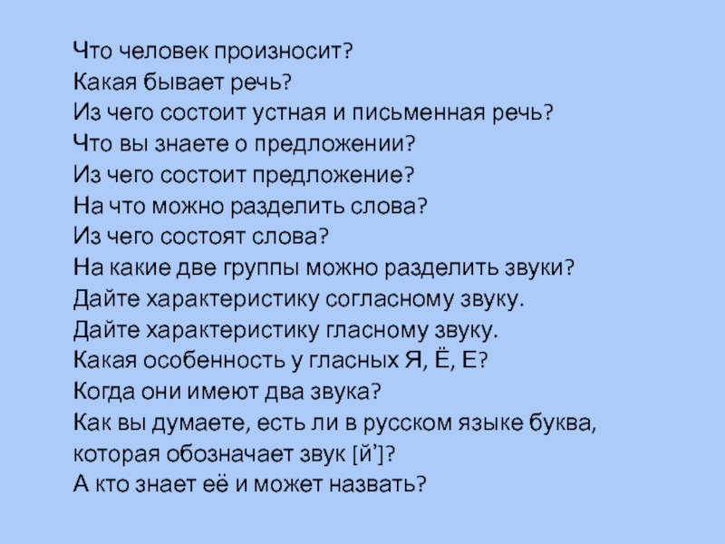 письменная речь? Что вы знаете о предложении? Из чего состоит предложение? На что можно разделить слова? Из чего состоят слова? На какие две группы можно разделить звуки? Дайте характеристику согласному звуку. Дайте характеристику гласному звуку. Какая особенность у гласных Я, Ё, Е? Когда они имеют два звука? Как вы думаете, есть ли в русском языке буква, которая обозначает звук [йʼ]? А кто знает её и может назвать?