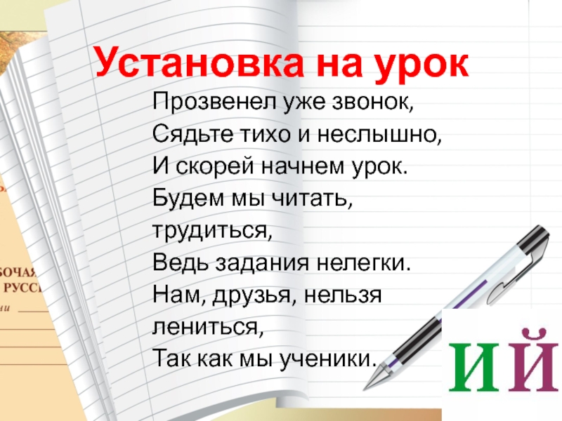 Установка на урокПрозвенел уже звонок,Сядьте тихо и неслышно,И скорей начнем урок. Будем мы читать, трудиться,Ведь задания нелегки. Нам, друзья, нельзя лениться,Так как мы ученики.
