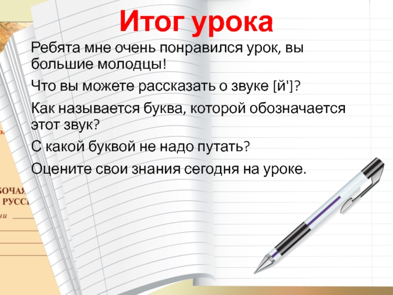 Итог урокаРебята мне очень понравился урок, вы большие молодцы!Что вы можете рассказать о звуке [й']?Как называется буква,