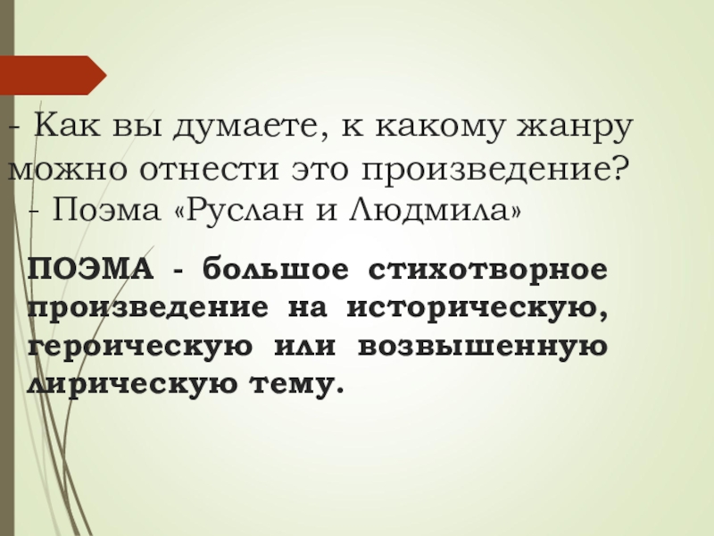 ПОЭМА - большое стихотворное произведение на историческую, героическую или возвышенную лирическую тему.