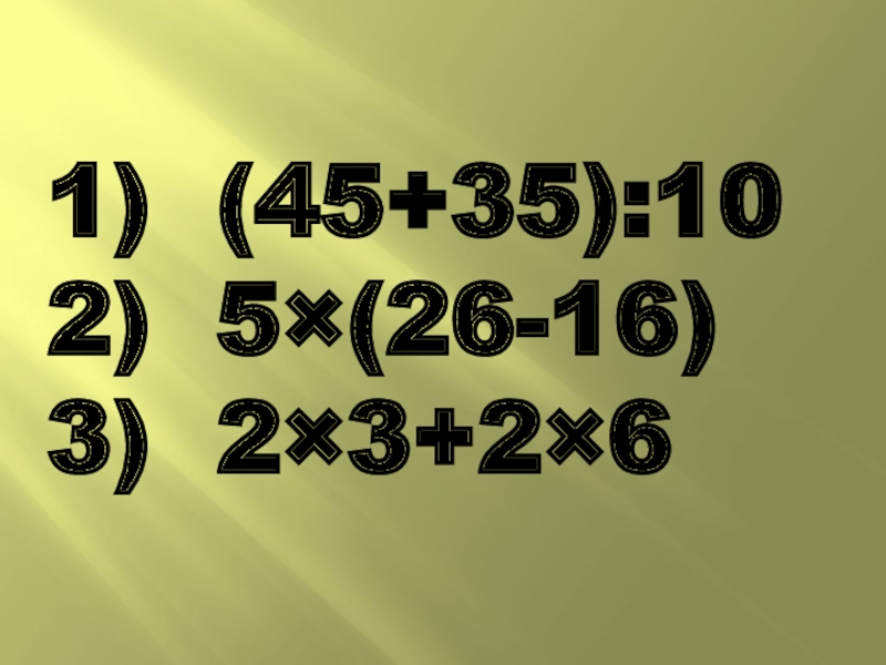 1) (45+35):102) 5×(26-16)3) 2×3+2×6