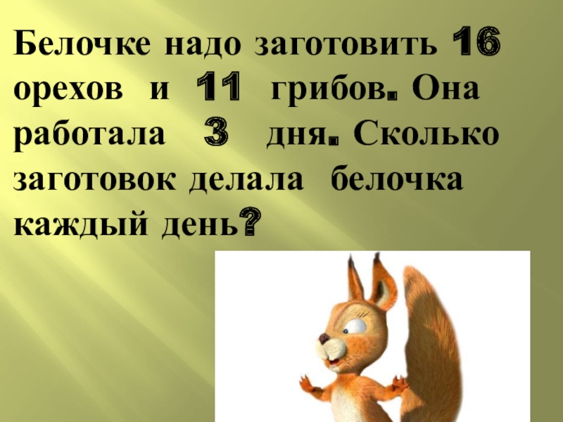 Слайд 10Белочке надо заготовить 16 орехов и 11 грибов. Она работала