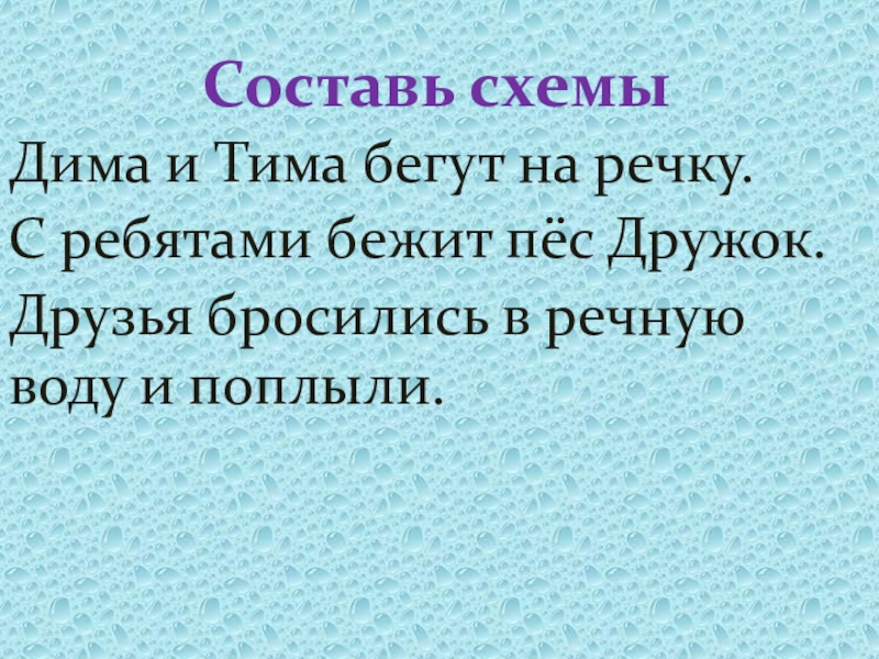 Составь схемыДима и Тима бегут на речку.С ребятами бежит пёс Дружок.Друзья бросились в речную воду и поплыли.