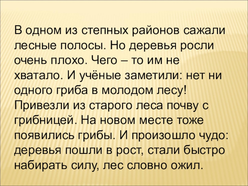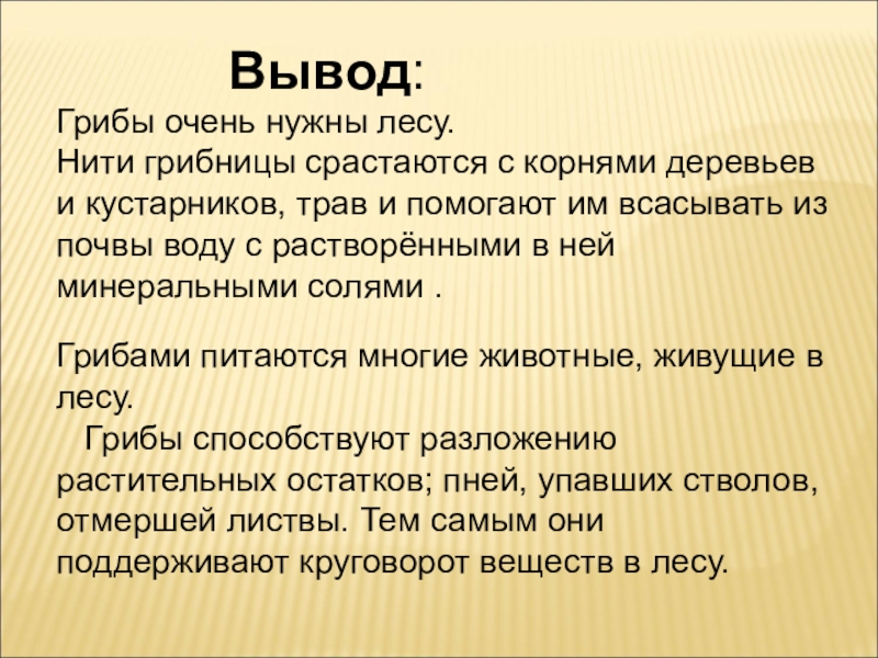 Нити грибницы срастаются с корнями деревьев и кустарников, трав и помогают им всасывать из почвы воду с растворёнными в ней минеральными солями .