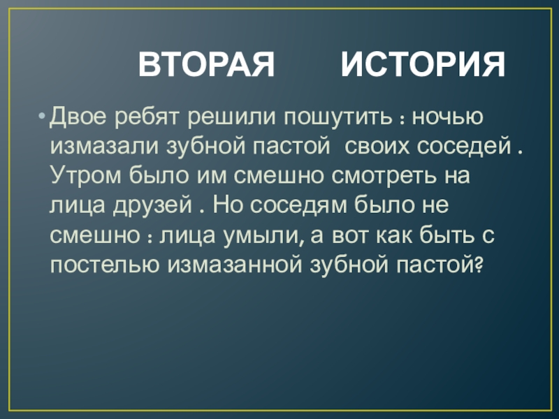 Двое ребят решили пошутить : ночью измазали зубной пастой своих соседей . Утром было им смешно смотреть на лица друзей . Но соседям было не смешно : лица умыли, а вот как быть с постелью измазанной зубной пастой?