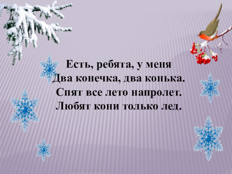 Есть, ребята, у меня Два конечка, два конька. Спят все лето напролет. Любят кони только лед.
