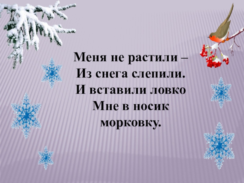 Слайд 5Меня не растили –  Из снега слепили. И вставили ловко Мне в носик морковку.